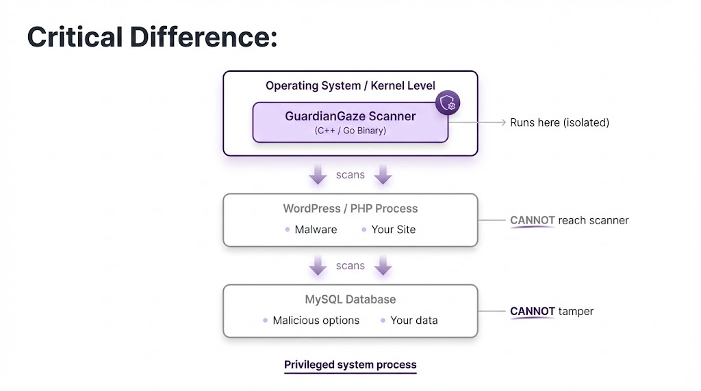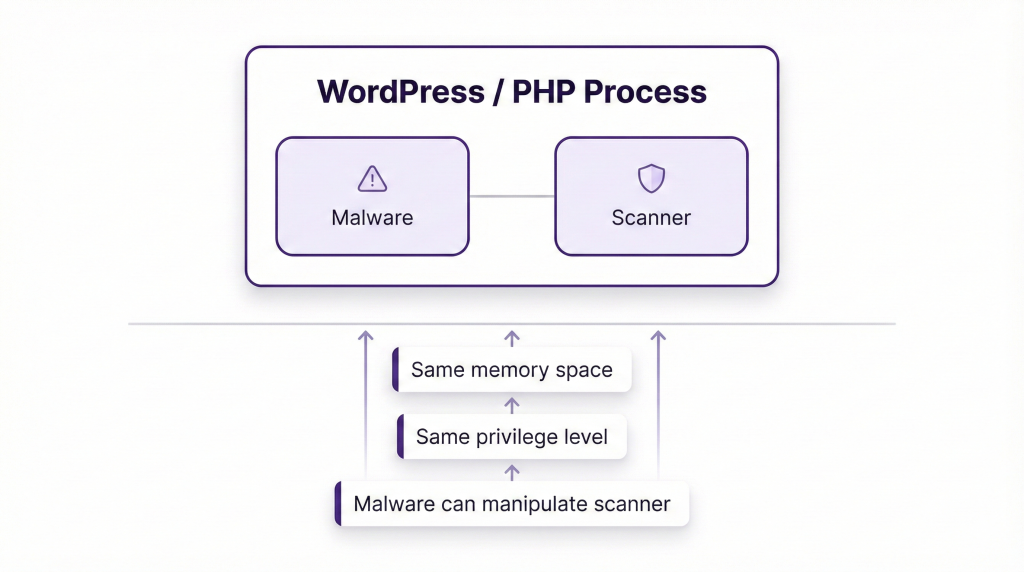 1. Traditional security plugins are broken – They run in the same process as malware and can be disabled
